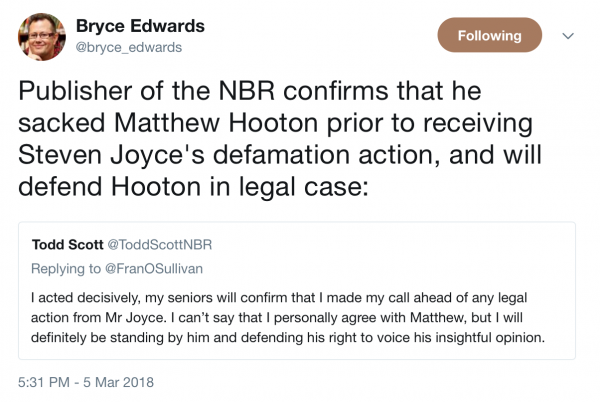 The Publisher and Owner of the NBR has had this to say about the sacking of Hooton…