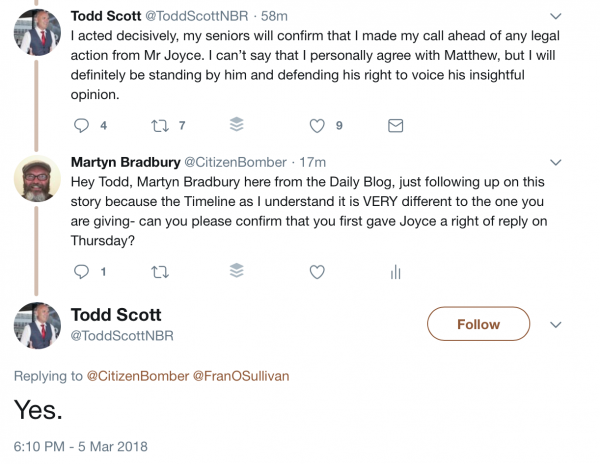 The NBR called Joyce and offered him right of reply to Joyce before the column was published.