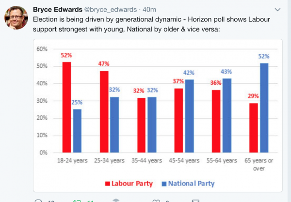 funnily enough I heard 3 students talking about voting, and all 3 were voting National. I know two of their families from league, but would suggest they are far more influenced by family and class, than some fictional generational movement