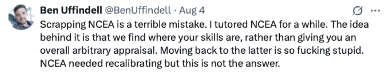 “Repeat the School C year and hope you passed next time, or leave school to look for some kind of manual labour.” Back in the day Kids were able to leave in the 5th form and get an apprenticeship or undergo vocational training. Now we force them to stay two extra years, when many of them would benefit more from the same options. Especially so these days when apprenticeships can lead to well paying jobs (secret, they could back them too). To make it work would require extra polytechs as many of the ones we had morphed into fee paying Universites. Having taught year 12, I would say a lot of students do better in the final exams having done internally assessed practical projects, especially in the tech field. Hopefully we aren’t throwing the baby out with the bathwater. Also with the arrival of AI do we know what we are trying to prepare them for? Even in just five years , many of the careers my year 12s were hoping to do don’t exist anymore.
