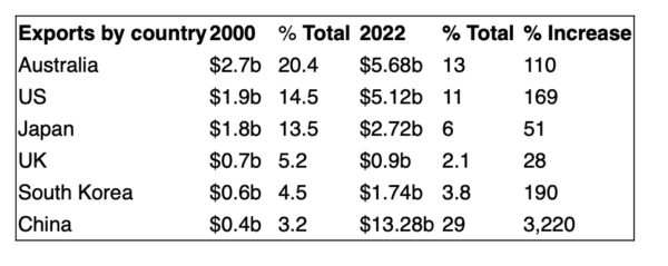 From the year 2000 to 2022 exports to China increased from less than half a billion dollars to $13.28 billion. This is an increase of 3,220%. Exports to China went from 3% of the total to 29%. Without China New Zealand would likely have suffered a significant economic decline.