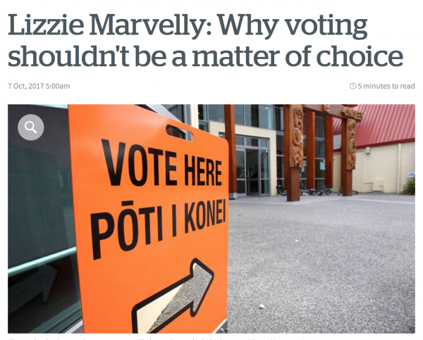 I am in favour of compulsory voting. But I agree that we should have a ‘no confidence’ option and/or people can write what they like on the voting form. All these votes would then be part of ‘none of you are giving me/us what we want’. One of the other things is the possibility of giving people a half day off to vote, you get paid if you have the sticker that says ‘I have voted’. I understand why people don’t vote especially those at the bottom of the heap who are not served by either of the major parties – we need to make it more attractive to them that they can say ‘you’re all useless’. We need to make this much more of a community event, encourage others to vote. Like many of my generation mid sixties, it was such a big deal we all wentdown to the school and waited outside while my parents voted. I can also remember us going down to the corner of Grange street and Opawa road to hear Norman Kirk speak.