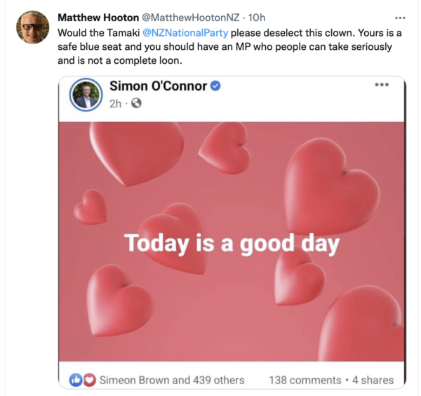 “Simon O’Connor’s post was taken down because it was causing distress and does not represent the position of the National Party.”