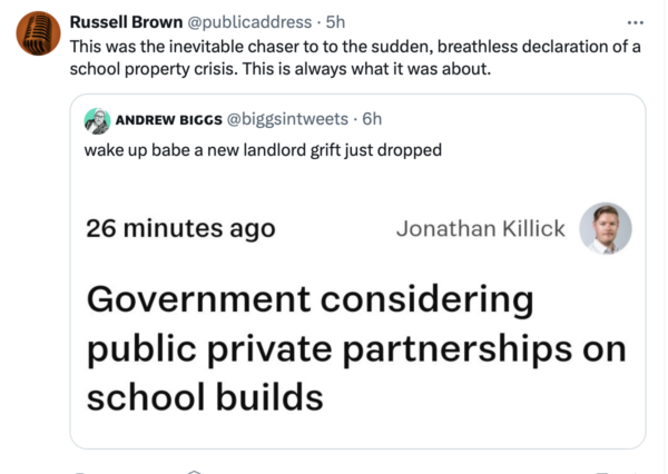National need to pretend there is a crisis in school infrastructure so that they can privatise it…