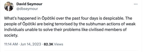 That’s why David Seymour’s ‘subhuman’ comment is so disgraceful and in fact far more terrifying than angry gang mourners because once someone is determined ‘subhuman’ by the State, the State legitimises any response.