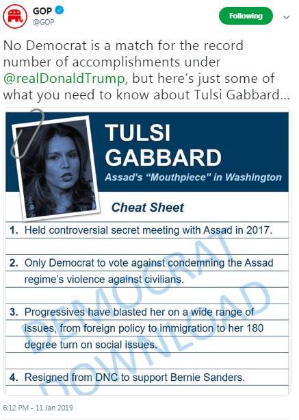 But when you get right down to it, there’s no way that the Republicans’ statement about Gabbard being anathema to and routinely attacked by “Progressives”, even if it were significantly true, is geared towards the Republicans’ own voters.