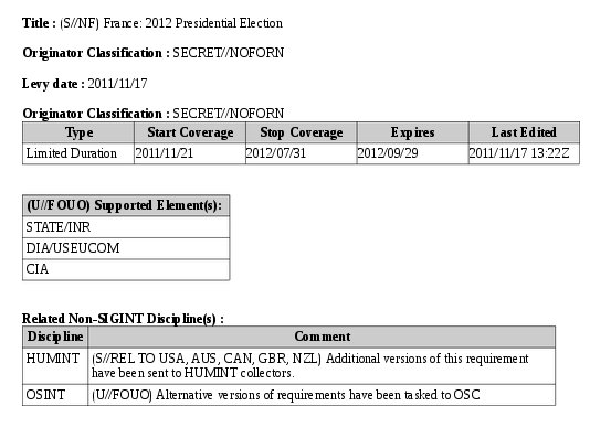 1. Looks like pretty routine HUMINT to me, sensitive only because the HUMINT was conducted in an allied state. The analysis is standard fare, comparable to what university election watchers would do. The documents show that it was a very low priority SIGINT target. Basically it was about getting a head’s up on the 2012 French elections and what might be expected from them. NZ was not involved in the HUMINT but was “copied in” on the distribution list as a member of 5 Eyes. No biggie, IMO.